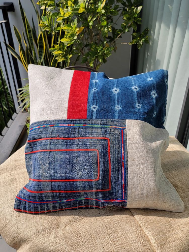 Taie d’oreiller modèle unique faite main tout en coton et bleu indigo naturel. Créé par une collectivité des minorités du Nord Vietnam